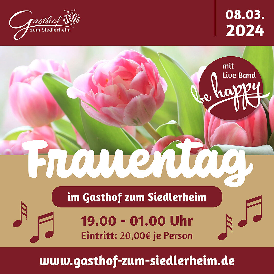 Der Abend gehört den Frauen! Wir veranstalten am 08.03.2024 eine Frauentagsparty mit musikalischer Live-Musik von Be Happy und vielen weiteren Überraschungen.